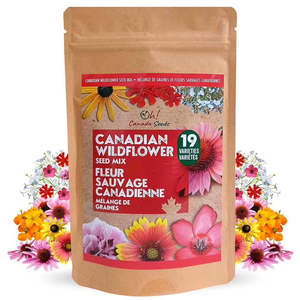 Mix of 19 non-invasive wildflower varieties native to Canada. Covers 750-1000 sq. ft. (70-92 m2). Zones 3-10. Bird and pollinator friendly (including bees). Mixed seed. Cold, heat, and drought tolerant, this mix will create splendid beauty for spring, summer and fall. Great for a garden border, living fence, or adding a little privacy to your yard; turn your lawn into a meadow!